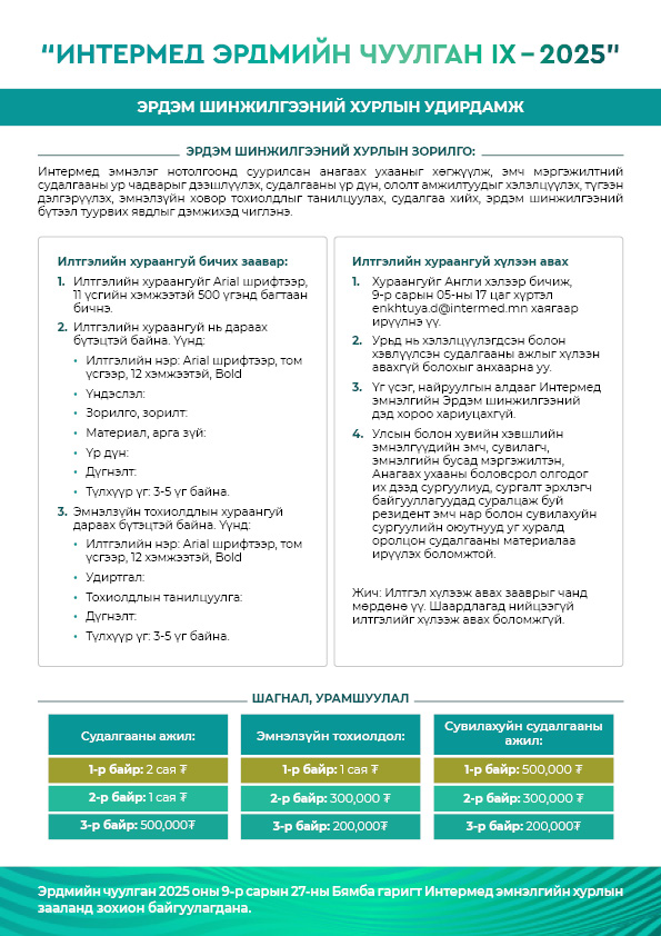 Интермед эмнэлгээс 9 дэх жилдээ зохион байгуулж буй Эрдмийн чуулган-2025 эрдэм шинжилгээний хурал энэ оны 9 сарын 27-ны өдөр болох гэж байна.