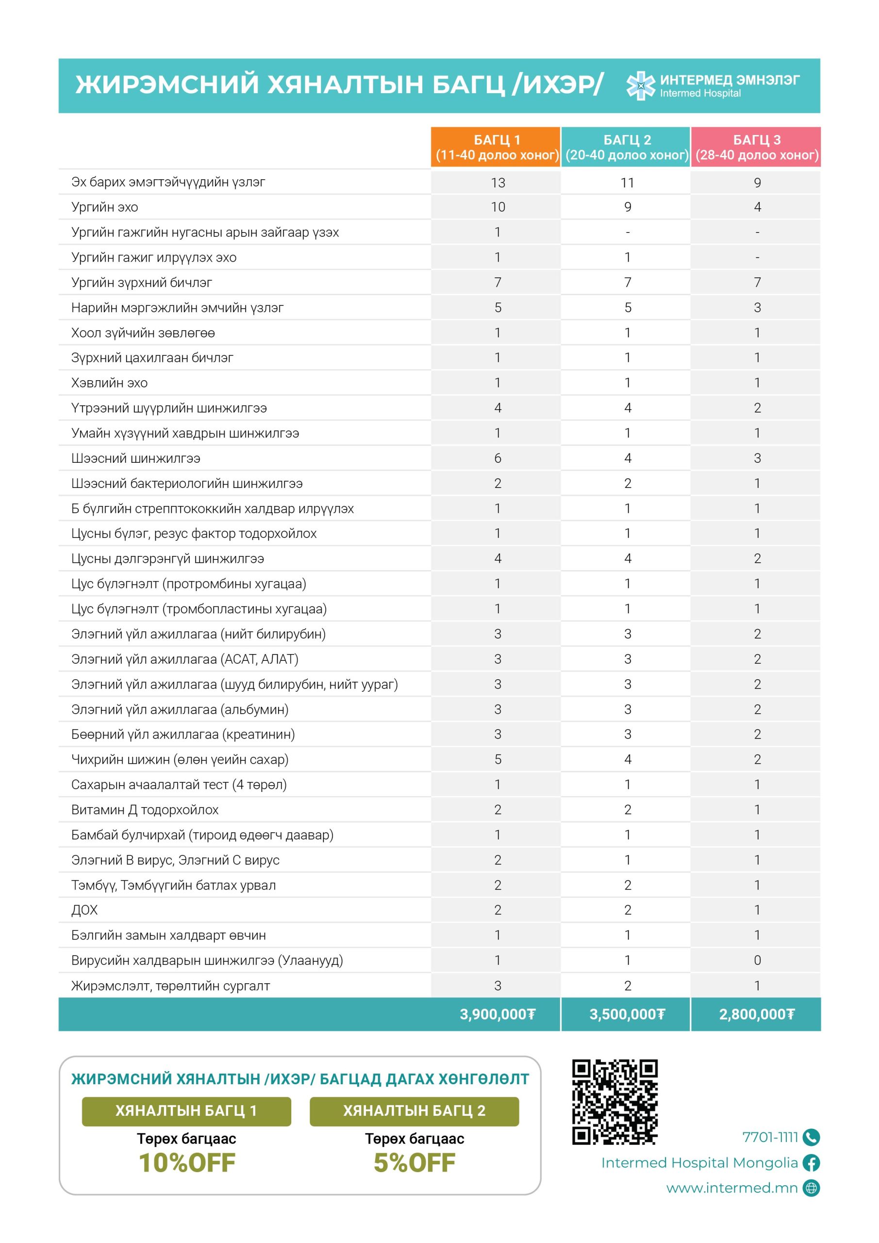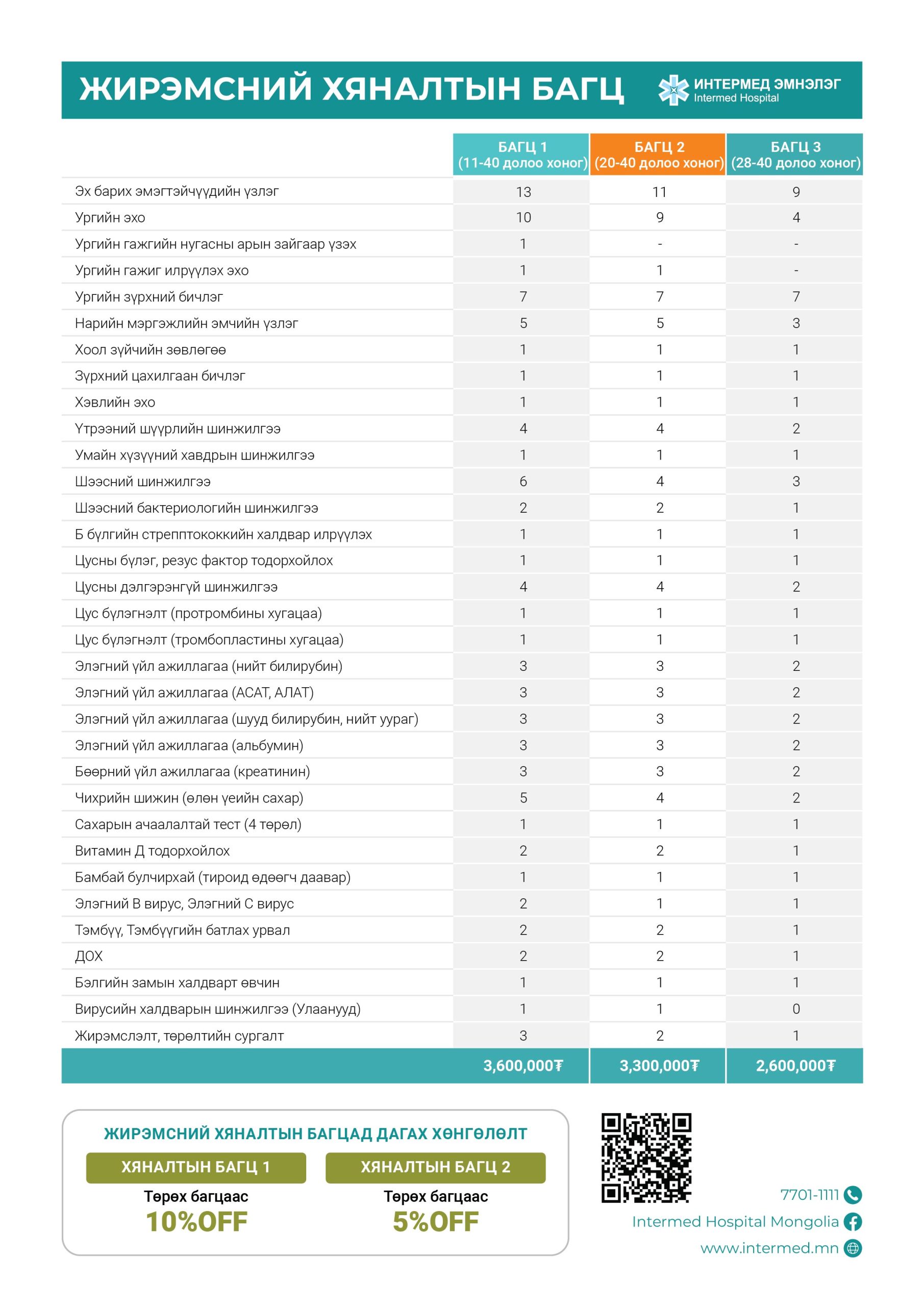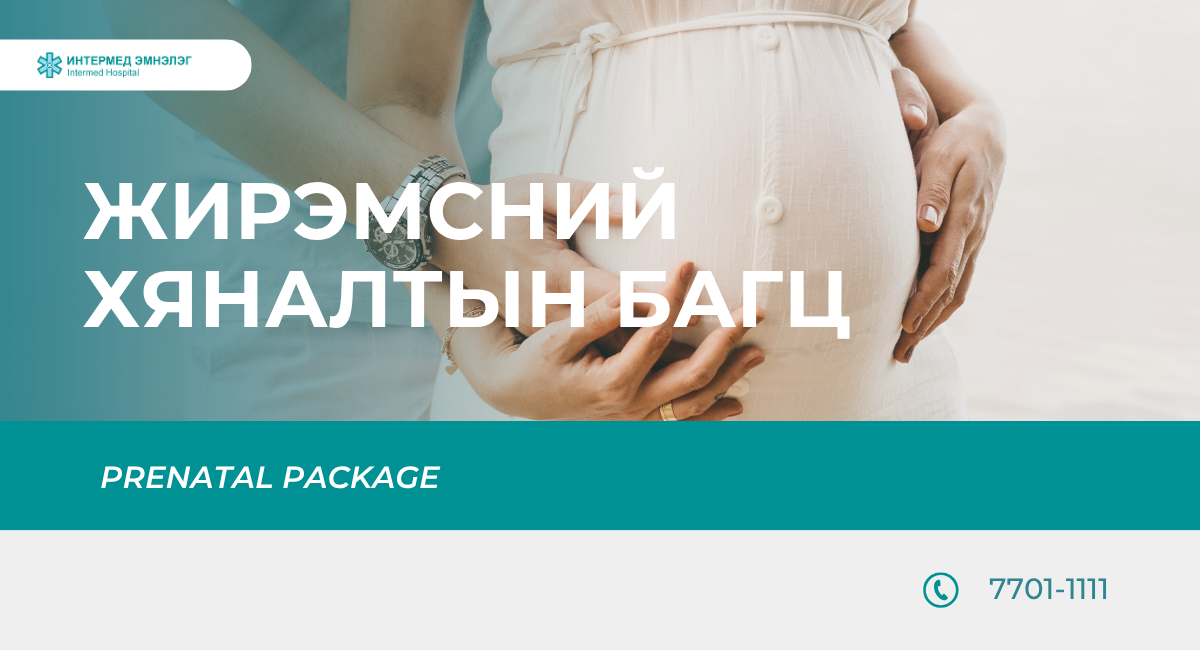 Жирэмсний хяналтын багцад хамрагдахыг тулд та Эх барих, эмэгтэйчүүдийн эмч дээр цаг авч үзүүлэн, багцад орох эсэхийг лавлаарай. Цаг авах утас 7701-1111.